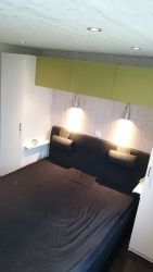 Modern stuga/lägenhet som ligger i änden av en lagerbyggnad. På ovanvåningen finns ett litet sovrum med 2 sängar och ett med en säng med draperi ut till vardagsrummet där det finns en bäddsoffa. På nedervåningen finns kök och matplats med 6 stolar samt braskamin i öppen planlösning. Sovrum med dubbelsäng (160 cm bäddmadrass) och badrum.