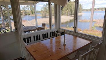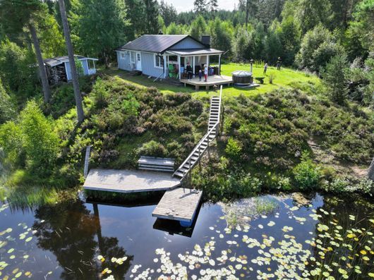 Omgivningarna är lugna och det finns inte någon granne direkt bredvid, men man ser flera andra hus längs med sjön. Det finns en vedeldad badtunna (inklusive ved) och en flytande träflotte med elmotor som är perfekt när man vill åka ut på sjön och bada eller fiska.