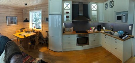 Stugan är ljus & trevlig med öppen planlösning & stora fönster.