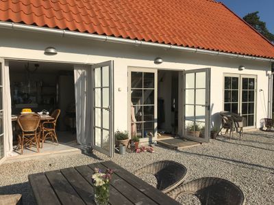 Huset ligger lagom ensligt mellan gårdar och ängar med magisk utsikt över öppna landskap. Cykel- och gångavstånd till närmaste stranden och till berömda Kutens Creperiet och den fantastiska franska restaurangen Albatross.