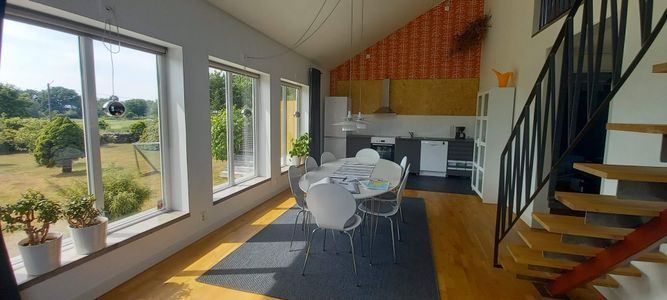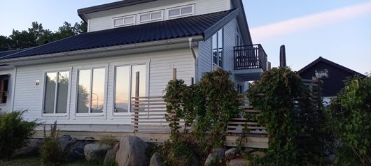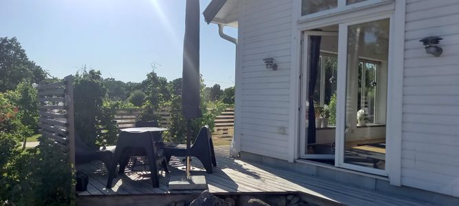 Vi har delat av 94m2 av vårt hus som vi hyr ut sommartid. Där finns ett stort matrum med kök, 2 sovrum med dubbelsäng i varje samt ett modernt kaklat badrum med dusch och tvättmaskin på bottenplan. Köket är fullt utrustat med diskmaskin, induktionsspis, ugn, micro, kyl och frys. På ovanvåningen finns ett stort allrum med en dubbelsäng och bäddsoffa med 2 bäddar.
