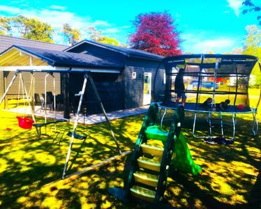 De har ordnat placeringen av boendet så att ni har tillgång till privat uteplats under tak, trädgård med gräsmatta, lekplats & parkering.