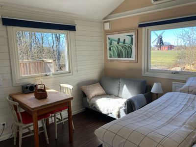 Mysig stuga på en charmig bondgård med höns, får, kor och hästar i Haverdal med fin utsikt mot Särdals kvarn från möblerad terass.