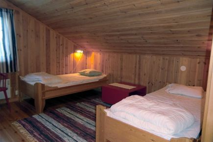 1 sovrum med 1 våningssäng och 2 fristående sängar på övre planet.