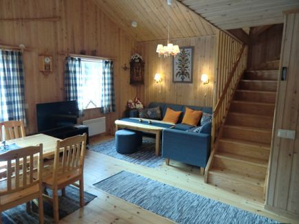 Stugan har ett stort mysigt allrum med öppen planlösning.