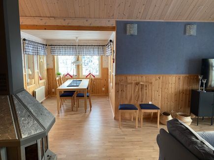 Vardagsrum: Öppen planlösning tillsammans med köket. Här finns en mysig soffgrupp med TV och braskamin.