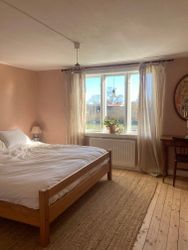En våning upp finns de båda sovrummen samt balkong med vy över fruktträd och solnedgång. I södra rummet sover familjens överhuvud gott i 180-centimeters furusäng med lyxig bäddmadrass. Och på norrgaveln finns två bekväma 90-sängar.