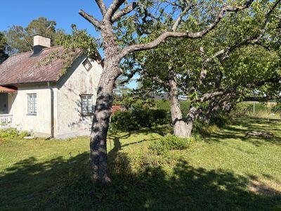 Stor trädgårdstomt med fin vy över åkrar mot Stenkyrka kyrka. Studsmatta finns på tomten.