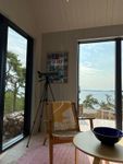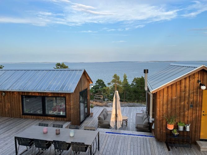 Fantastiskt läge med tre nybyggda hus som ligger i anslutning till varandra sammanbundna med ett stort trädäck. Husen ligger högst uppe på en klippa med otroligt vacker utsikt över Jungfrufjärden. Man har även tillgång till egen brygga och bastu nere vid vattnet, det går att bada genom att hoppa från bryggan eller gå i från stege men ingen badstrand. Det är en ca 200m promenad på en naturstig för att komma till huset som ligger 25 meter över havet.
