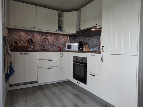 Vardagsrum och kök i öppen planlösning. Bäddsoffa med bäddmadrass (140cm), matbord med stolar.