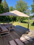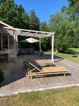 Stugan har också en 150m2 stor veranda i två väderstreck, vilket ger möjlighet att vara ute och njuta av solen oavsett tid på dagen. På verandan mot havet finns en loungemöbel och på baksidan hittar du ett utekök med grill.
