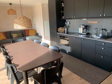 KÖK: Fullt utrustat med diskmaskin, spis, ugn, kyl, frys, elvisp och stavmixer. Matplats för upp till 11 personer. Bordet kan göras större vid behov. Barnmatstol med matbricka, Ikeas antilop, finns att låna.