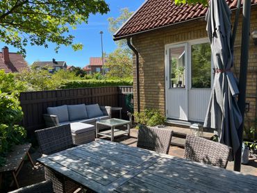 I trädgården finns uteplats med både matbord och soffdel, studsmatta samt gungställning.