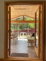 Mysig stuga nära havet uthyres för 4 personer. Två sovrum med två sängar i vardera rum. Uteplatser i öst-, syd- och västerläge samt ett inglasat uterum på 18m².
