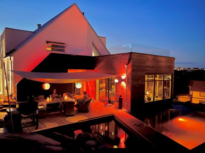 Villa i Lysekil med stor skyddad parkering utanför dörren. Ljuvlig takterrass med panoramautsikt över Gullmarn, uteplats med gasolgrill, bad-damm med vattenfall och koi-fiskar, och SPA-bad. 4 sovrum, 2 vardagsrum. 1 toalett med dubbelduschar, 1 gästtoalett, samt en toalett under renovering. Toalett med dubbelhandfat kan nyttjas även i detta badrum, men inte dusch.