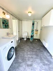 Rymligt badrum med dusch och tvättmaskin. Sängkläder, handdukar (inkl kökshandduk) tar ni med er.