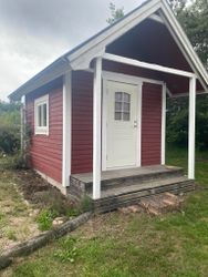 Några steg skiljer entré, badrum och kök från resten av huset. Från kaminen som är placerad mitt i huset sprider sig en härlig värme och mysfaktorn är hög från både soffa och fåtöljer inne i vardagsrummet. I samband med vardagsrummet finns en separat sovrumsdel och ovanför ett sovloft med två bäddar dit man når via en brant trappa. Altandörr till husets baksida leder dig genom det inglasade uterummet till altanen med utemöbler och grill. Här finns även en gäststuga med bred säng. Perfekt hus för familjen i olika åldrar.