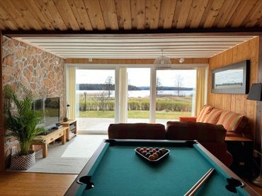 • Rymligt vardagsrum med högt i tak, öppen spis och stora fönster mot sjön