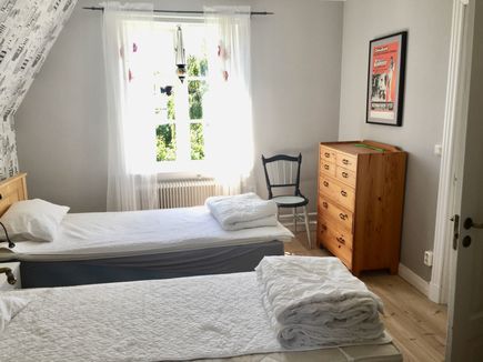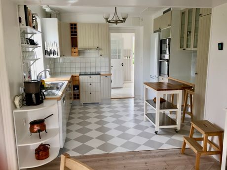 Representativ 1920-talsvilla i två plan om 150 m2. Tillbyggt med charm och i husets tidsanda med generösa, luftiga ytor. Du möts av en stor, vacker hall med glasveranda. På nedervåningen finns kök, matrum och allrum, wc/dusch samt ett sovrum. På övervåningen finns ytterligare tre sovrum och ett wc. Alla sängar är 90 resårmadrass. Inga våningssängar.