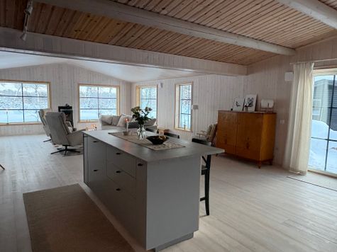Den ljusa och fräscha fjällstugan rymmer tre sovrum, ett fullt utrustat kök med plats för åtta personer, stort badrum med tvättmaskin, torktumlare och torkskåp samt ett stort allrum med braskamin – perfekt för avkopplande kvällar efter dagens äventyr.