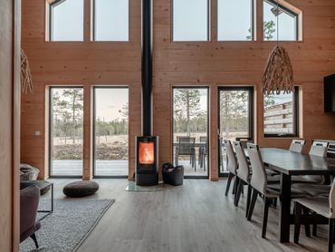 Husets hjärta har imponerande 7 meter takhöjd, stora fönster mot myren och en vedkamin i centrum.