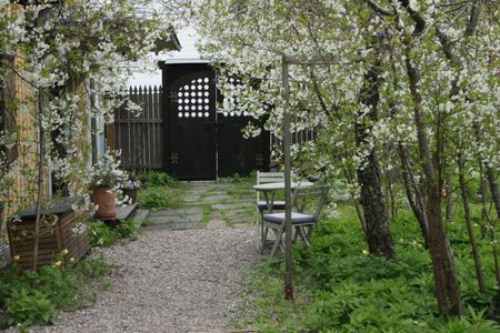 I trädgården finns ett antal uteplatser med bord och stolar/solstolar samt en veranda med 2 korgstolar och bord och bärbar Webergrill.
