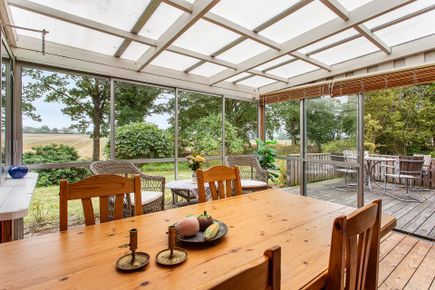 På tomten finns även ett dubbelt garage samt två parkeringsplatser vid huset. Till huset kör man förbi en hästhage där man med lite tur kan bli hälsad av de stolta hästarna. Från terrassen ser man ut över ängar och åkrar, där det inte sällan dyker upp rådjur eller till och med någon enstaka älg.