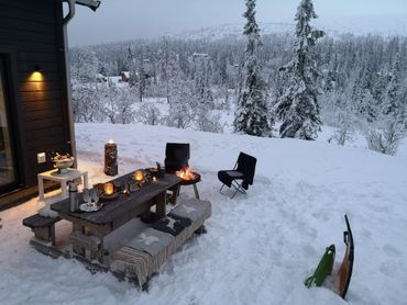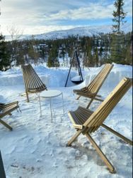 Huset har en stor altan i soligt läge, perfekt för avkoppling efter en dag på fjället. Parkering finns för flera bilar och motorvärmaruttag finns.