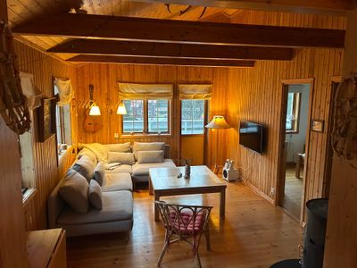 Kök och vardagsrum delas med en halvtrappa. Toalett separat och ett badrum med dusch och bastu (6personer).