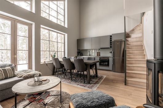 ● Vardagsrum med braskamin, soffa, fåtölj, soffbord, tv och utgång till uteplats. Stort fönsterparti som ger mycket ljusinsläpp.