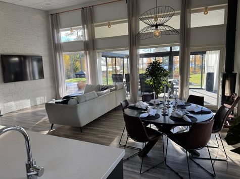 Öppen och harmonisk planlösning där kök, matplats och vardagsrum tillsammans skapar en härlig social yta att umgås på under vistelsen.