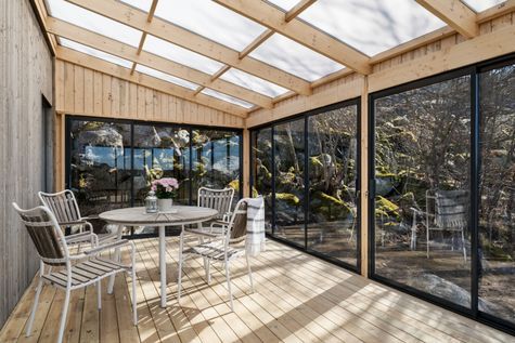 Husets hjärta är det stora allrummet/köket på entréplanet - här ryms stor matplats med plats för upp till 8 personer, en mysig soffdel samt ett öppet, fullt utrustat kök. Hela rummet har ett otroligt ljusinsläpp och hela tre altandörrar som öppnas upp ut mot den stora, härliga altanen samt till uterummet. Från allrummet samt altanen och uterummet har du en fantastisk utsikt mot havet och de lantliga omgivningarna.