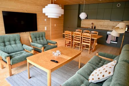 Lägenheten ligger i markplan, med parkering på tomten. Det finns tre sovrum med sammanlagt sex sovplatser, sköna sängar med täcken och kuddar ingår. Ett av sovrummen har dubbelsäng och stort fönster med fjällutsikt. De två mindre sovrummen har våningsängar (90 cm). Hyllor, galgar och krokar för klädförvaring finns i alla sovrum. Vardagsrummet är möblerat med soffa, fåtöljer och tv och har fönster med utsikt över fjället från golv till tak. Fullutrustat kök med induktionshäll, diskmaskin, kyl/frys, varmluftsugn, mikro och kaffebryggare. Hallen har gott om krokar, hängare och hyllor. Lägenheten har två badrum, det ena med WC och tvättmaskin, och det andra med dusch, bastu och torkskåp. Golvvärme värmer kalla fötter i hela lägenheten, klinker i hall och badrum och massiva trägolv i övriga rum.