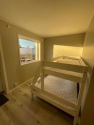 Sovdel med familjevåningssäng. Bäddsoffa i vardagsrummet med bädd på 140 cm.