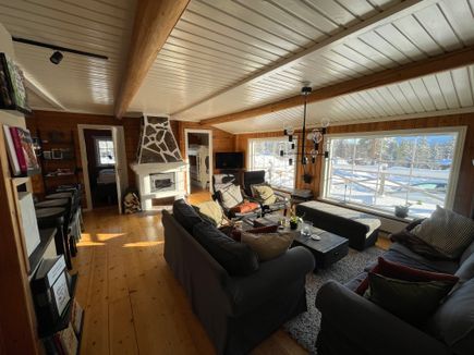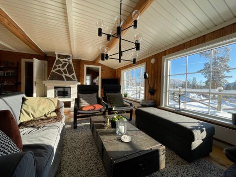 Det finns ett stort vardagsrum med öppen planlösning till köket som tillsammans erbjuder goda sällskapsytor för hela familjen. Här finns en större soffgrupp samt en otroligt fin murad öppenspis som ger skön värme i hela stugan.