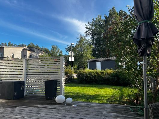 En vacker terass med matplats och grill ger extra glans på sommaren och bastu/gillestuga övriga året. Balkong på övre plan.