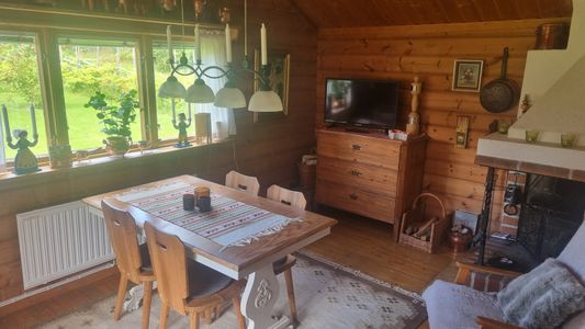 Fastighet bestående av två hus. ”Storstugan” på ca 34 kvm med sovalkov, avdelad med draperi till köket (2 separata bäddar), vardagsrum, välutrustat kök och toalett med dusch. ”Sovstugan” på ca 26 kvm med 2 sovrum (dubbelsäng + våningssäng) och utrymme för kläder/väskor. OBS! Ingen toalett i ”Sovstugan”.