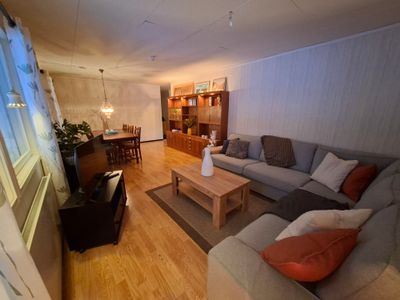 Det fullt utrustade köket har matbord för minst 6 personer, perfekt för att laga mat och äta tillsammans. Vardagsrummet är också rymligt, med mysig sittgrupp, TV och ett annat matbord för minst 6 personer, idealiskt för gemensamma måltider eller spel.