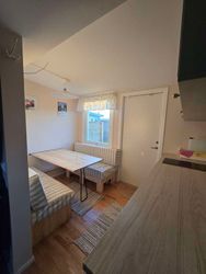Charmig och yteffektiv sommarstuga om 18 m² med öppen planlösning där kök och sovdel samspelar utan hel vägg emellan. Matplatsen kan enkelt fällas ner och förvandlas till säng, vilket ger flexibel användning av ytan.