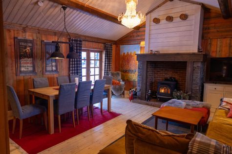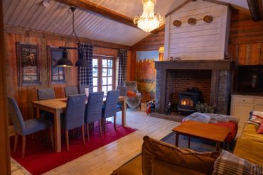 Mysig storstuga med allrum och matplats i öppen planlösning med takhöjd ca 5 meter, kamin och härlig divansoffa.