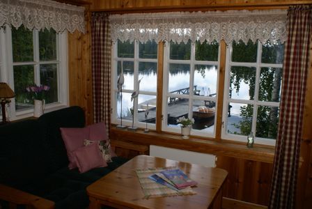 Närmare sjön kommer Du inte! Mindre stuga med ett sovrum för 4 personer i 2 våning-sängar. Litet kök och allrum i ett, samt mulltoalett/förbränningstoalett och dusch med bästa utsikten. Verandan under tak för härliga sommarkvällar.