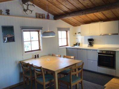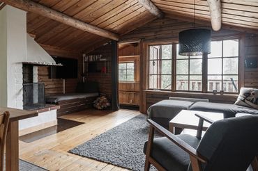 • Kök och allrum i öppen planlösning; soffgrupp och matgrupp (iläggsskiva matbord finns), öppen spis, tv. Köket är utrustat med kyl med frysfack, skafferi med