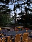 Utomhus är altanen väldigt generös med ett stort matbord (plats för 8-10 personer), vilstolar och en härlig hörnsoffa. Solen kommer redan på morgonen och lyser på altanen hela dagen. Så väderstrecket är perfekt. Lyser den för mycket finns ett stort parasoll.