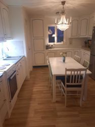 Huset på Sturkö är stort och rymligt med öppen planlösning. På första våningen finns vardagsrum, trevligt möblerat och med kamin. Ett mindre rum med bäddsoffa och ett välutrustat kök med matplats för sex personer. Det finns också en separat matsal, samt en inglasad altan och en stor öppen altan.
