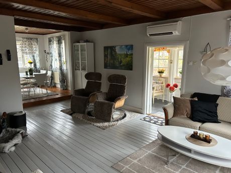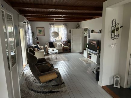 Njut i ett rymligt och charmigt hus från 20-talet i populära endast 150m är du nere vid en 6km lång sandstrand med en fantastiskt solnedgång att njuta på kvällarna.
