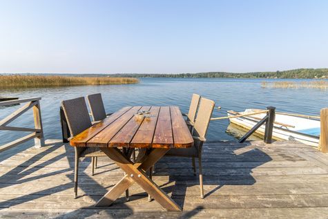 (huvudbyggnad och gäststuga) inom 5 m från strandlinjen. Bryggan har en bekväm badtrappa ner i vattnet