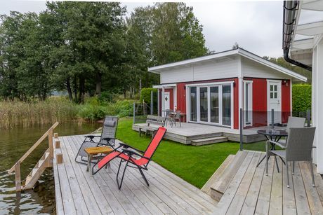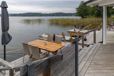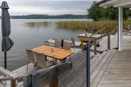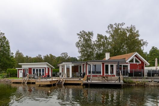 dörr-/glaspartier, rymliga altandäck och från huvudbyggnaden ett par steg till möblerad hängbrygga.