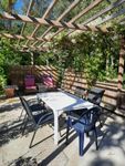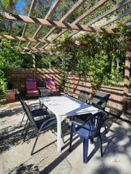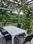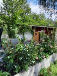 Stugan ligger vid en liten sjö (damm). Nere vid vattnet finns bastu med relaxrum, På tomten finns också en pergola med rosor, murgröna och vindruvsranka. Här kan du ljumma sommarkvällar sitta under lampors sken och njuta av den vackra naturen.