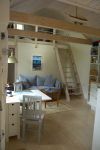 Inne i huset finns två sovrum och ett sovloft, totalt sex sovplatser, vilket ger gott om plats för familj eller vänner. Den öppna planlösningen mellan kök och vardagsrum skapar en luftig och funktionell yta för umgänge. Badrummet är utrustat med dusch, och toaletten ligger med egen ingång från gaveln där även en utedusch finns tillgänglig. I anslutning till den finns även en bastu som är tillgänglig för en extra kostnad. Utanför finns en altan som omsluter huset och erbjuder en plats att äta, grilla eller bara njuta.