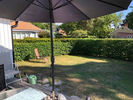 Modern lägenhet i markplan med stor insynsskyddad uteplats 150 meter från den fantastiska stranden. I pittoreska Ljugarn med ett par hundra meter till Strandcaféet, Bruna Dörren, Smakrike och Pighuset ligger denna moderna fritidsbostadsrätt, som tidigare var en del av det fashionabla badpensionatet. Nyrenoverad 2007 med modernt kök och toalett. Sovrum med en familjesäng, 120 bred nere och 80 uppe, samt en mindre utdragssäng under (mer anpassad för barn). Bäddsoffa 140 cm i allrum. Matplats i glasad veranda samt träaltan med utemöbler och parasoll. Stor insynsskyddad uteplats med gräsmatta och fri parkering intill lägenheten. Mindre TV och Wifi finns i lägenheten. I bostadsrättsföreningen finns tvättmaskin och torktumlare. På uteplatsen finns en Weber kolgrill.